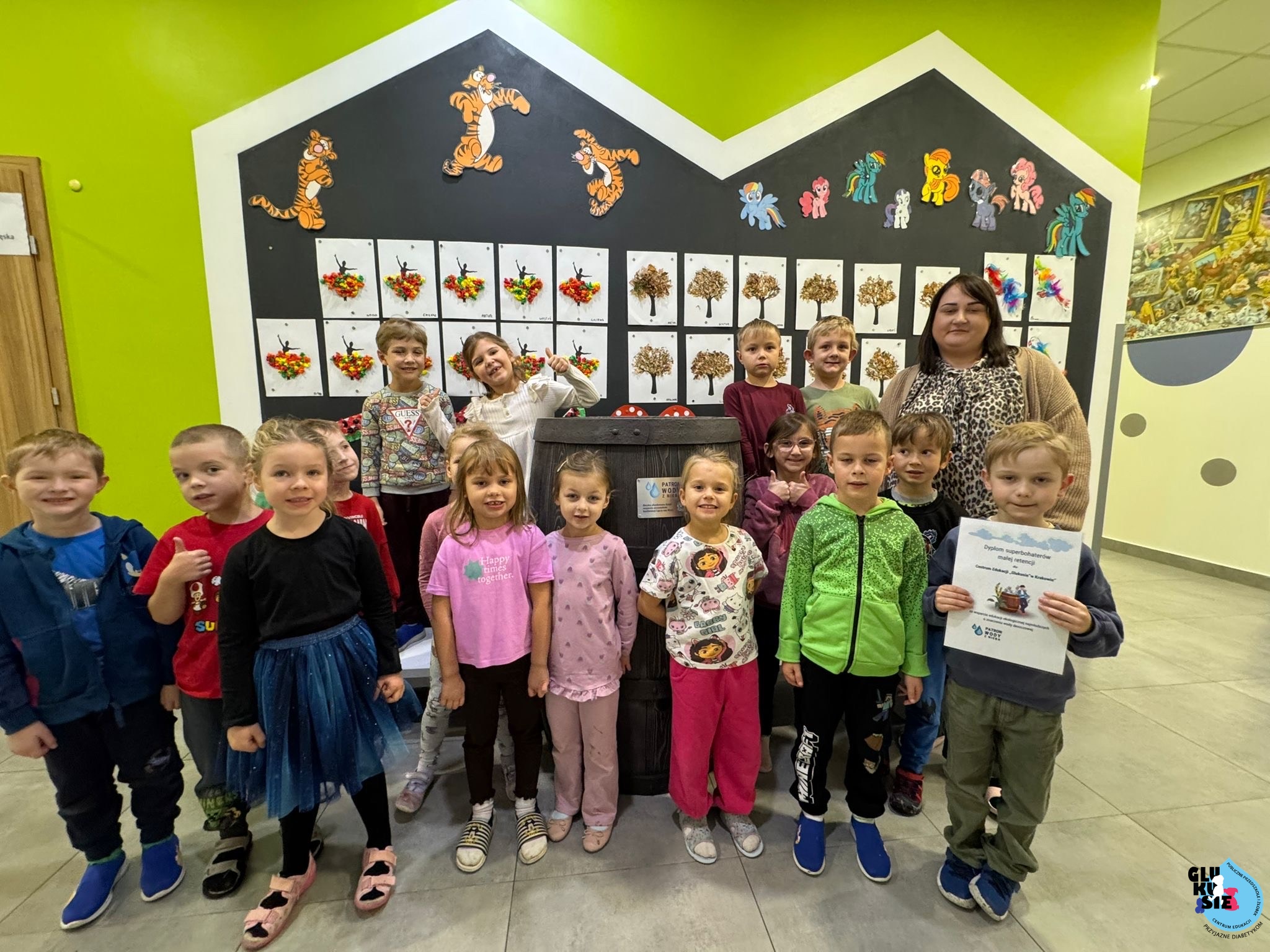 Jesienią nasze przedszkole otrzymało w darowiźnie beczkę na deszczówkę podarowaną przez Fundacją Biznes dla klimatu w ramach akcji „Patron wody z nieba” (https://manifestklimatyczny.pl/patron-wody-z-nieba/). Na wiosnę beczka ta stanie na naszym placu zabaw aby dostarczać wody deszczowej do podlewania prowadzonych przez dzieci ogródków. Korzystanie z beczki do codziennego podlewania ogródka zmniejszy ślad nasz ekologiczny oraz pozwoli przedszkolakom na praktyczną naukę oszczędzania wody. Mamy nadzieję, że inne osoby korzystające z bieżącej wody do podlewania swojego ogródka lub działki dzięki działaniom naszych przedszkolaków również zastosują to korzystne dla środowiska rozwiązanie.