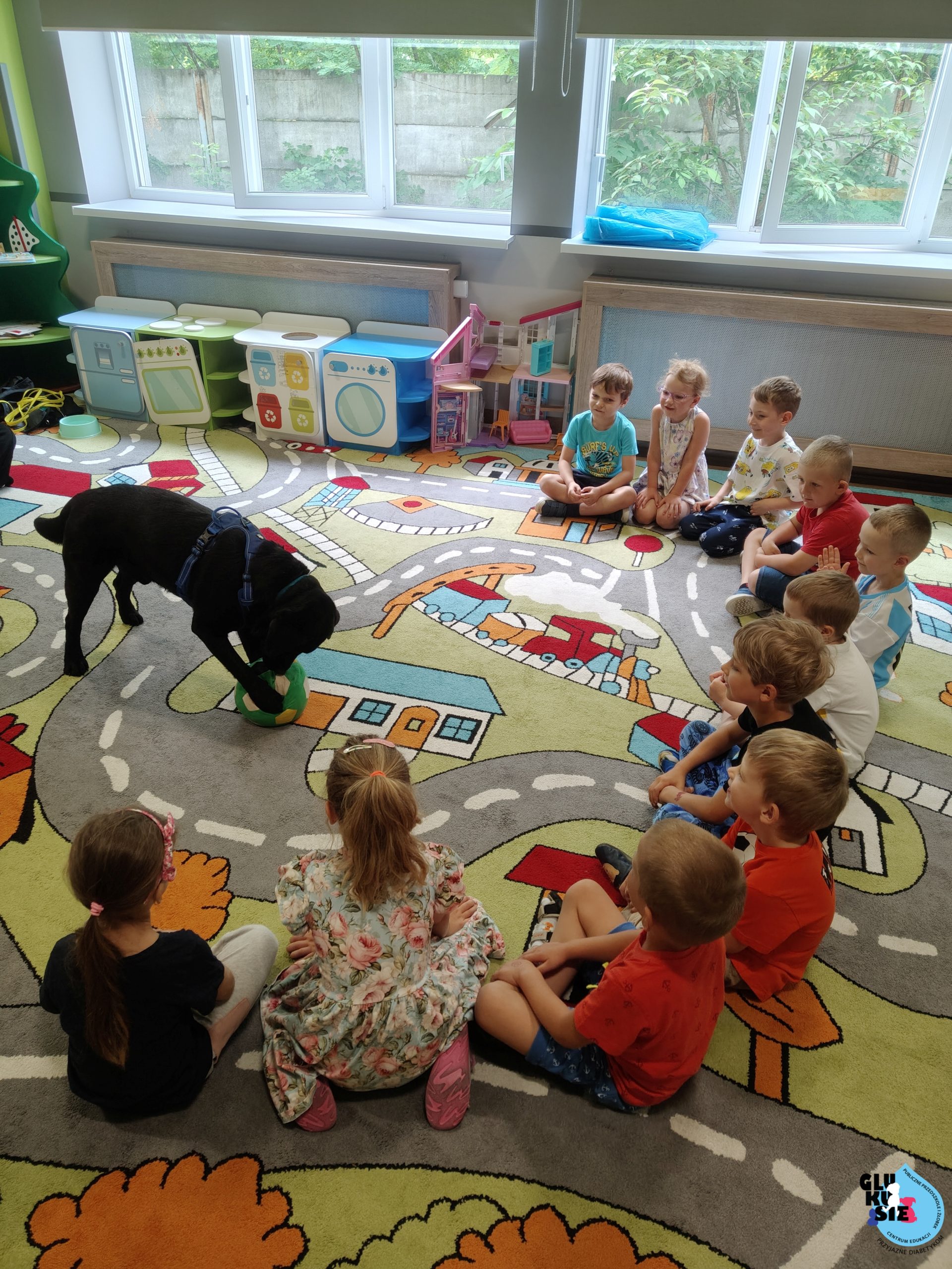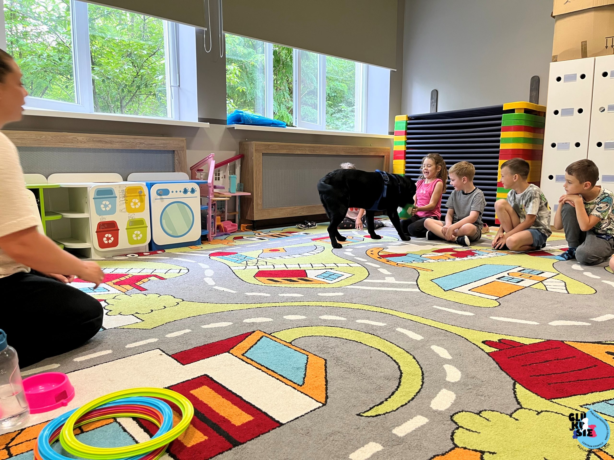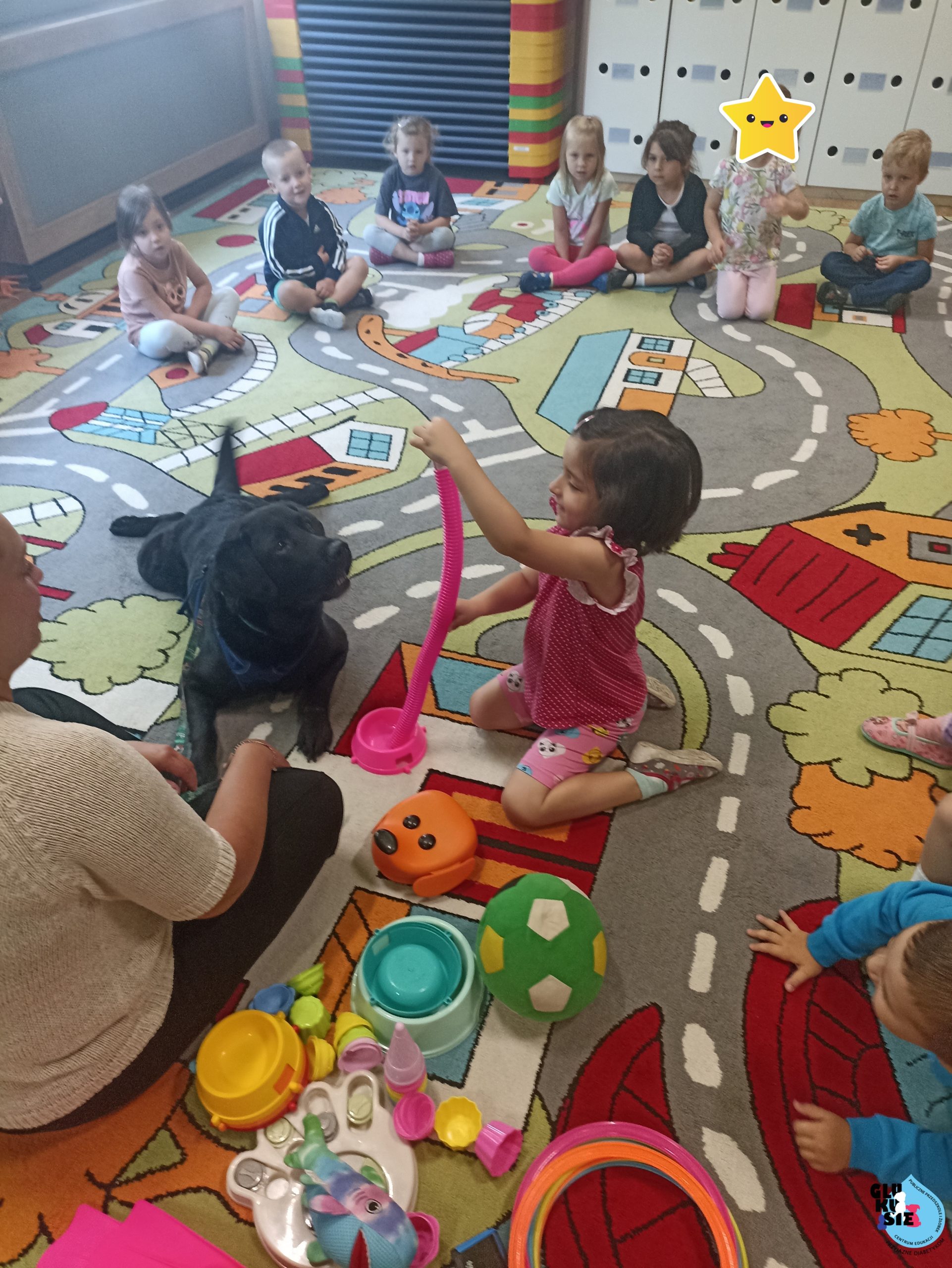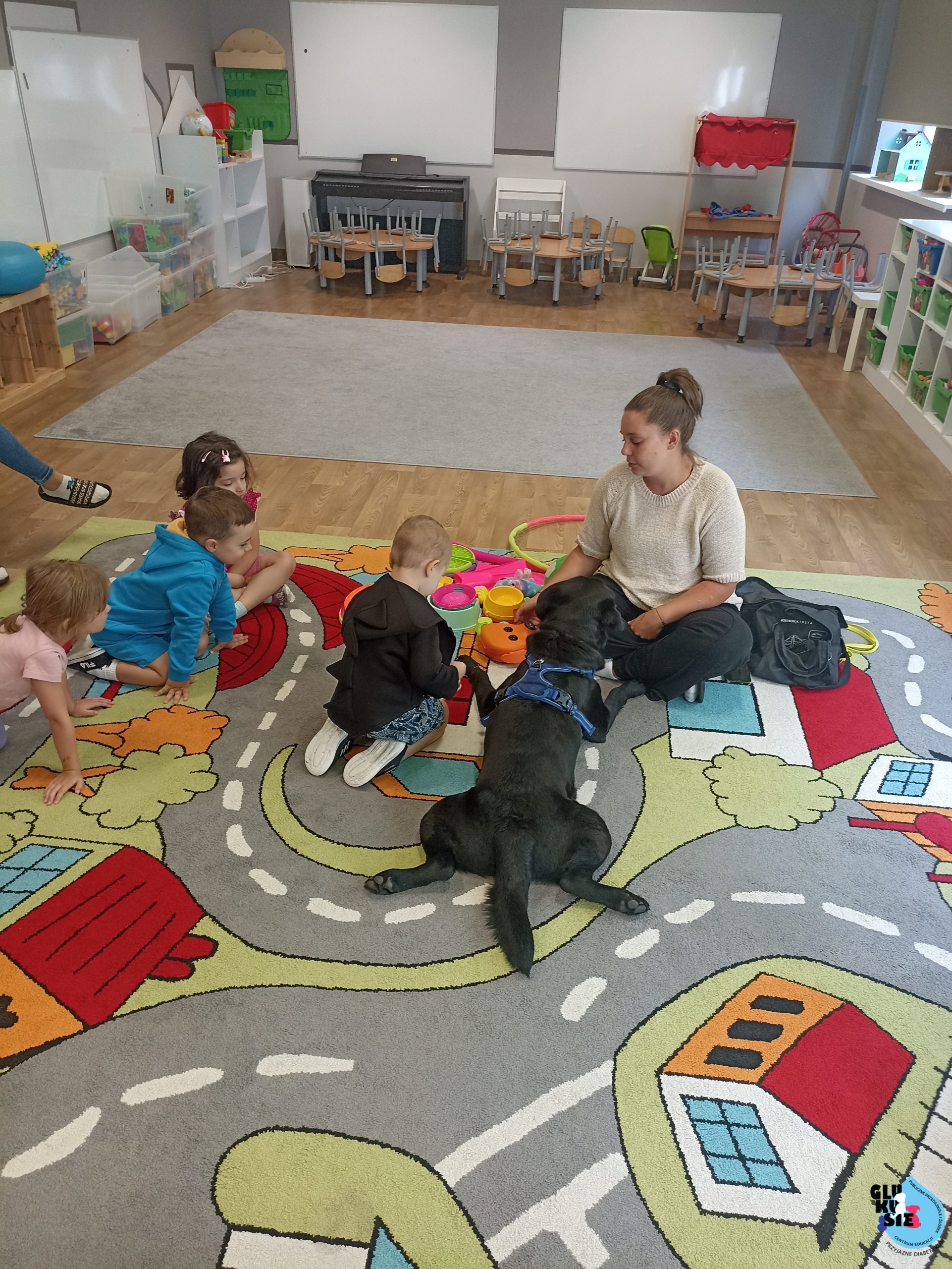 Opiekunka Bueno przeprowadziła zabawy edukacyjne z elementami dogoterapii, której celem jest wszechstronny rozwój podopiecznych, dostarczanie pozytywnego bodźca i satysfakcji z przebywania z psim przyjacielem.