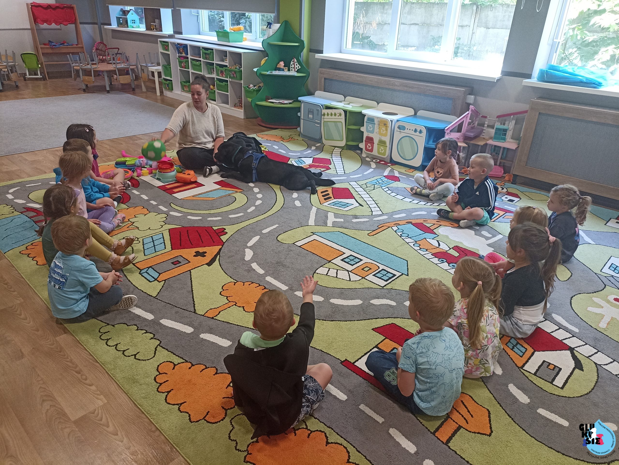 Dzieci z całego przedszkola zostały zapoznane z pieskiem oraz dowiedziały się jak należy zachować się w jego obecności.